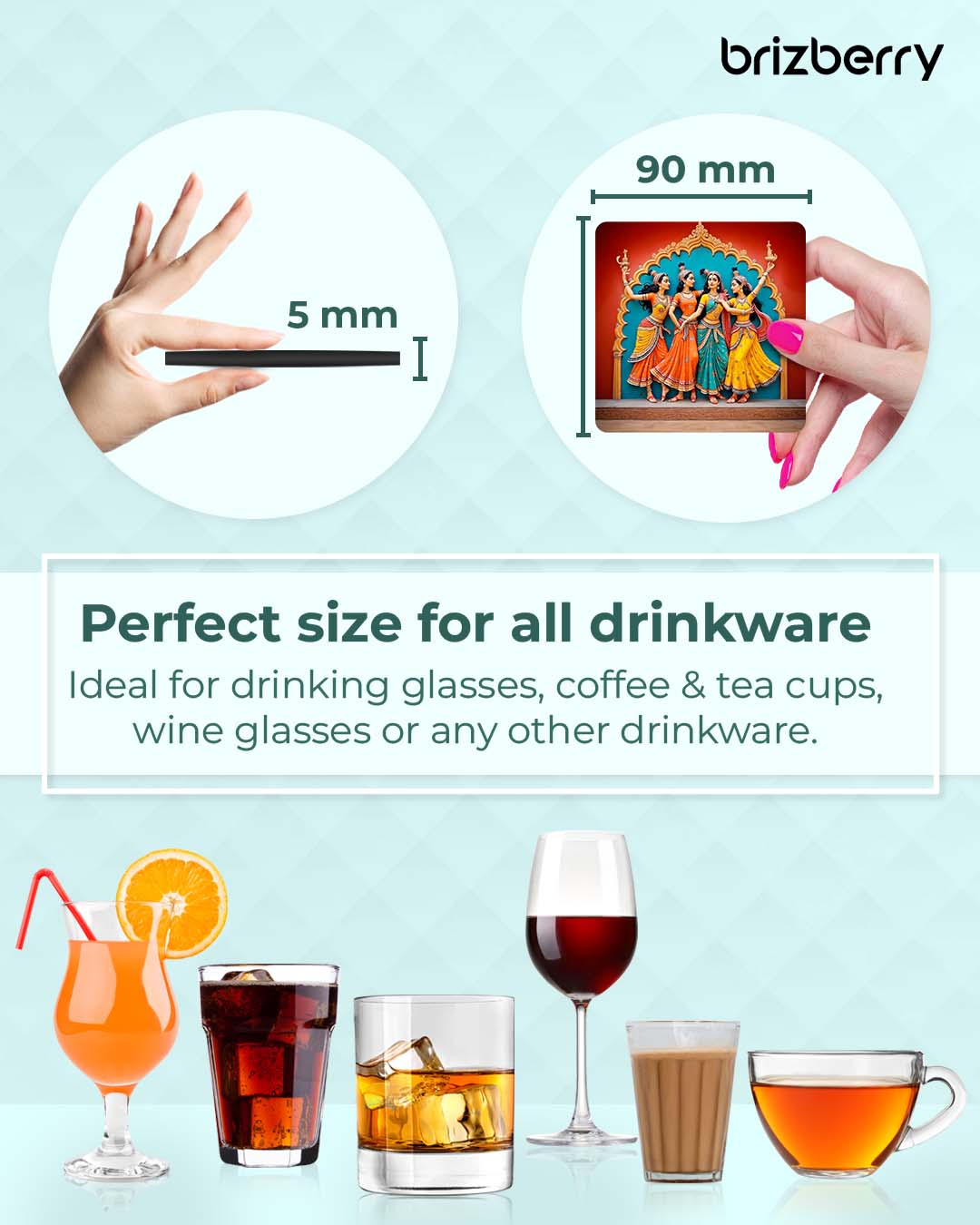 PERFECT SIZE : Set of 6 Coasters – 3.5 x 3.5 Inch & 4mm Thickness and that's Perfect for Glass, Bottles or Mugs of various Sizes.